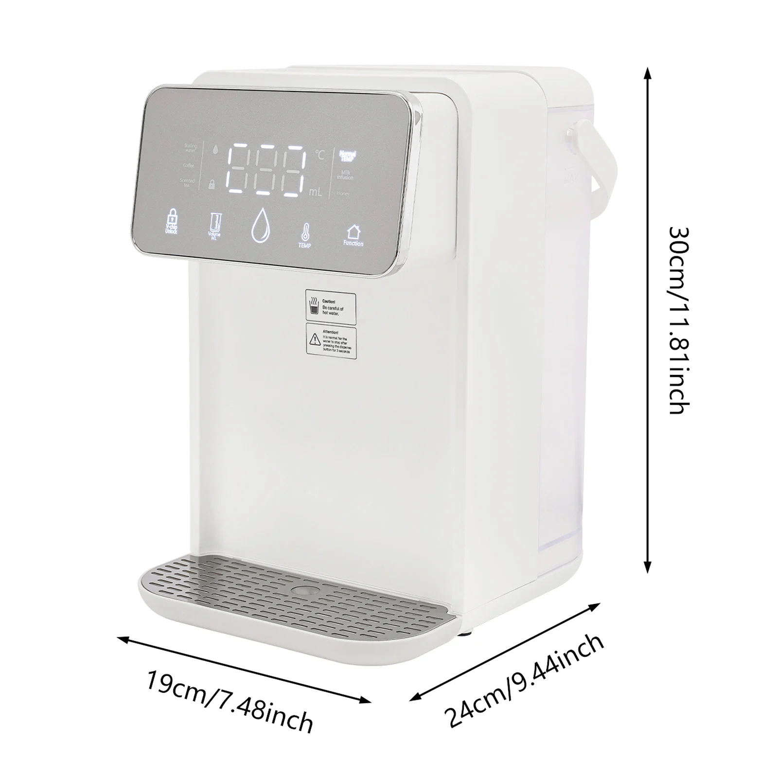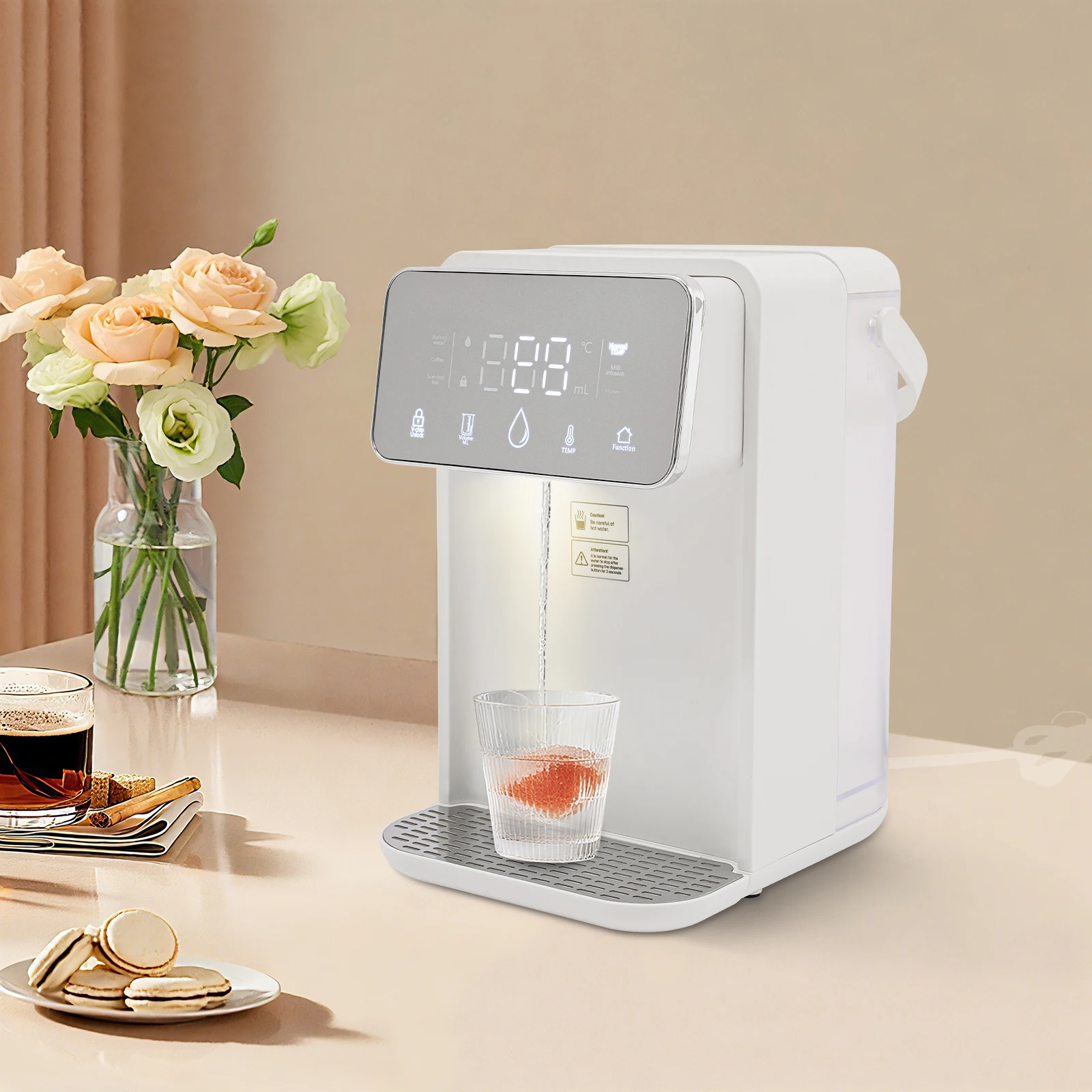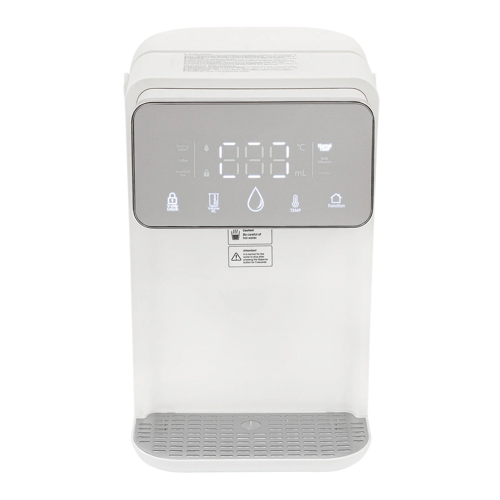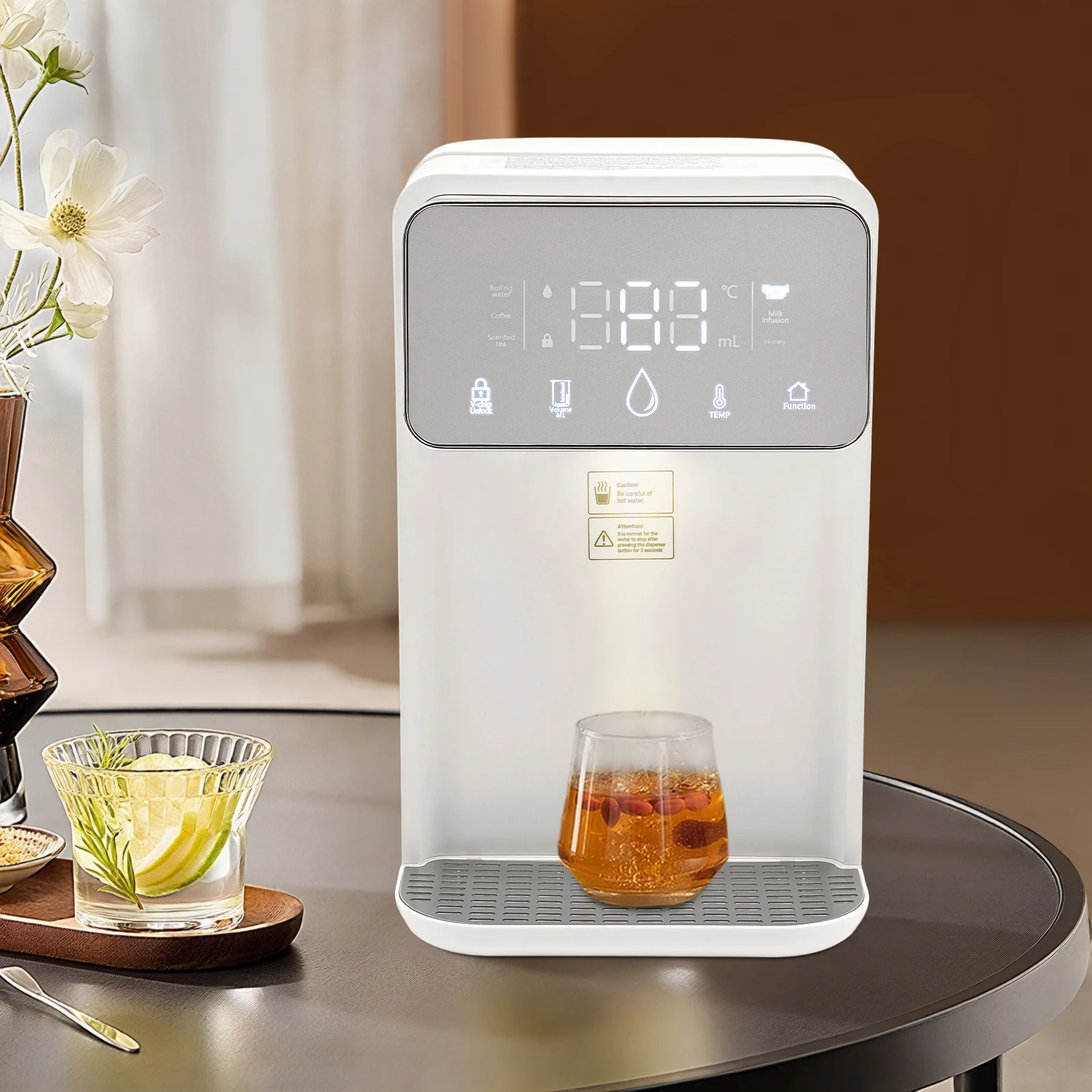 Skip the kettle and enjoy boiling or warm water in just seconds with this sleek instant hot water dispenser. Perfect for coffee, tea, baby bottles, or instant meals, it delivers precisely heated water from 77°F to 210°Fat the touch of a button. With a large 3.5L (0.77Gal) tank, you can serve multiple drinks without constant refilling. The digital display lets you set both temperature and volume, so every cup is just right. Designed with safety in mind, it features a built-in night light, drip tray, and cool-touch handlefor easy handling. Compact and modern, it fits perfectly on any kitchen counter, office desk, or nursery—making hot drinks faster, easier, and more convenient every day.