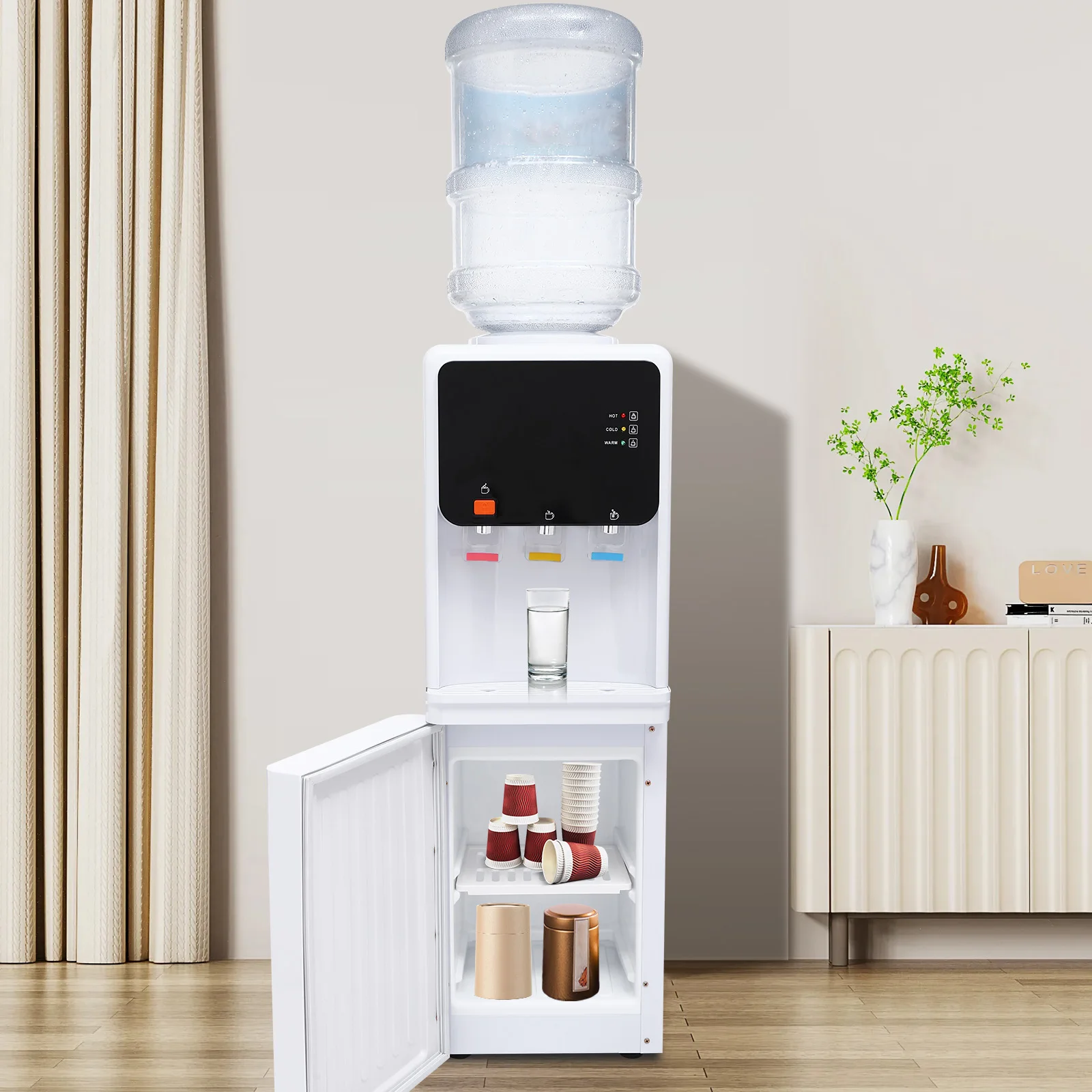 User Friendly: It is equipped with a child safety lock function to prevent accidental scalding. In addition, the space at the bottom with the dustproof door can be convenient for you to place cups, tea leaves, coffee, etc., which can prevent dust while also making it easy for you to store and access them.